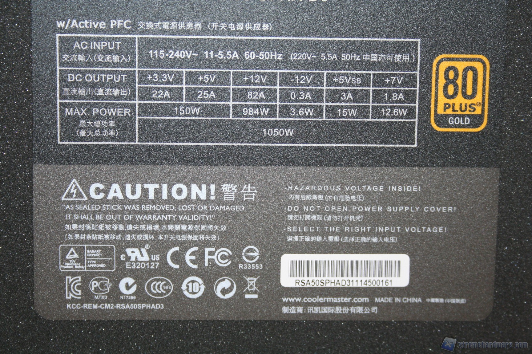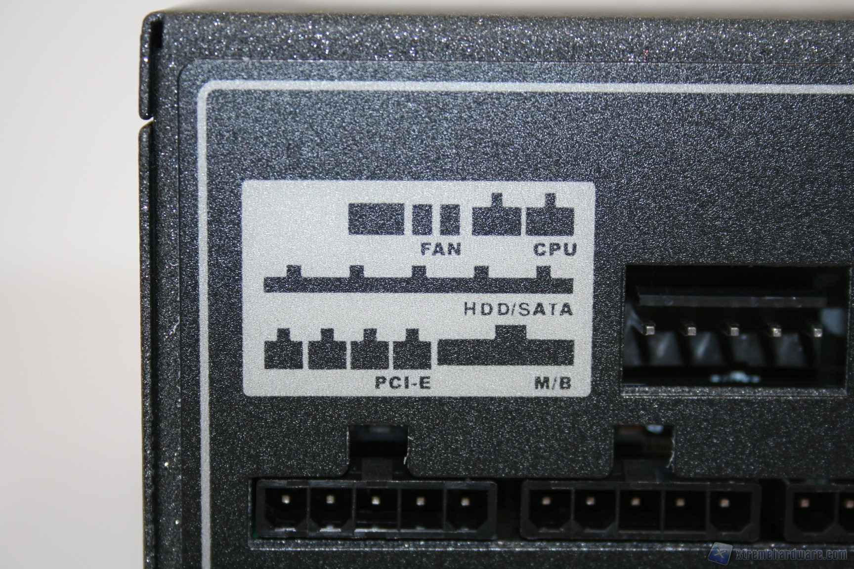 Il Cooler Master è completamente modulare, anche l'utente meno esperto riuscirà a connettere tutti i cavi per il normale funzionamento del PC grazie ad un piccolo schema illustrativo sull'utilizzo dei connettori, posizionato direttamente sotto in connettori ausiliari di alimentazione delle PCIe, colorate in grigio chiaro.